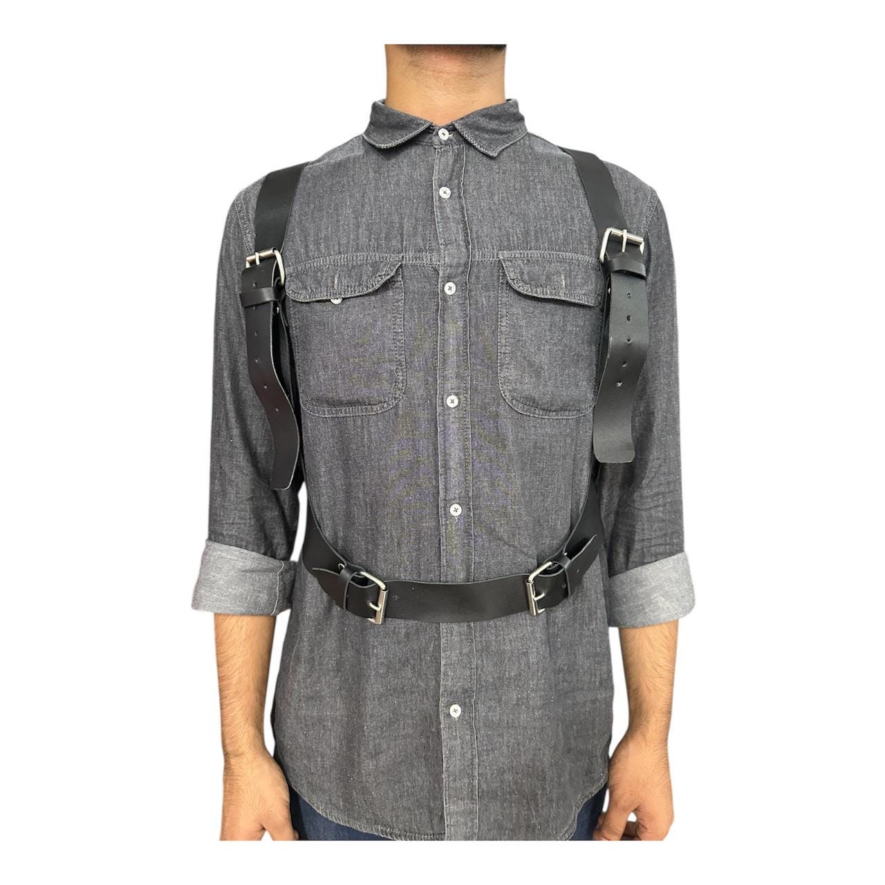 Upgrade your style with this handcrafted black leather harness, designed for comfort, durability, and a bold statement look. Made from premium genuine leather, this harness features strong adjustable buckles on the shoulders and waist, allowing for a secure and customizable fit.