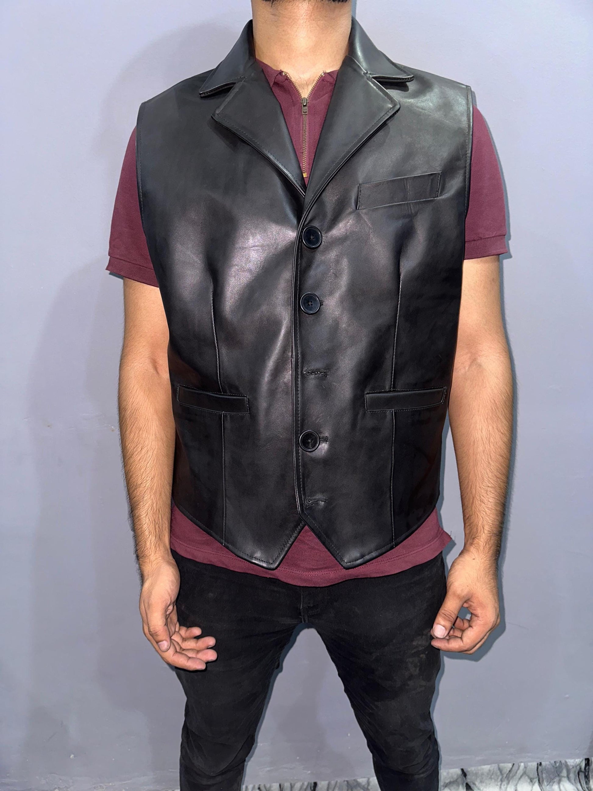 This black leather waistcoat blends traditional tailoring with a bold, modern edge. It features a sleek lapel collar, five-button closure, and functional front pockets—perfect for adding a refined touch to both casual and formal outfits. The natural shine of cow leather gives it a luxurious look, while the inner lining ensures comfort and a smooth fit for all-day wear.