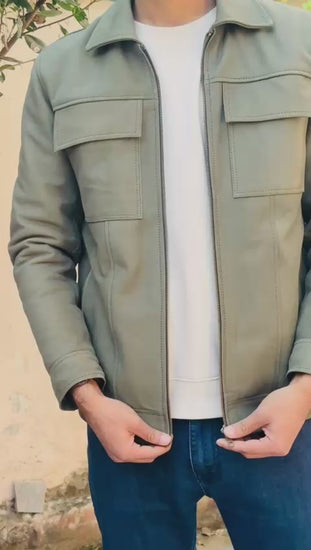 Elevate your everyday style with this handcrafted men's green nubuck leather jacket. Designed with a timeless military-inspired silhouette, this jacket features a soft, matte nubuck finish and two front flap pockets for a rugged yet refined look. The zip-up closure and clean-cut seams add modern functionality, making it perfect for layering over casual wear or elevating your streetwear ensemble.